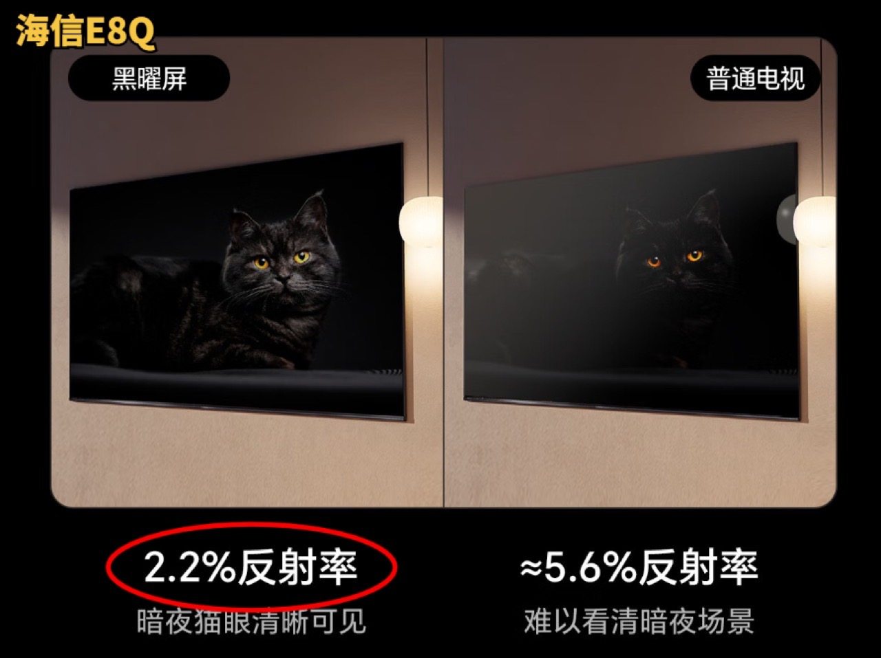 再来看反光控制,Q9L Pro用了0.5%低反射膜和89°排列液晶分子,整机反射率仅1.8%;而E8Q的反射率为2.2%。
