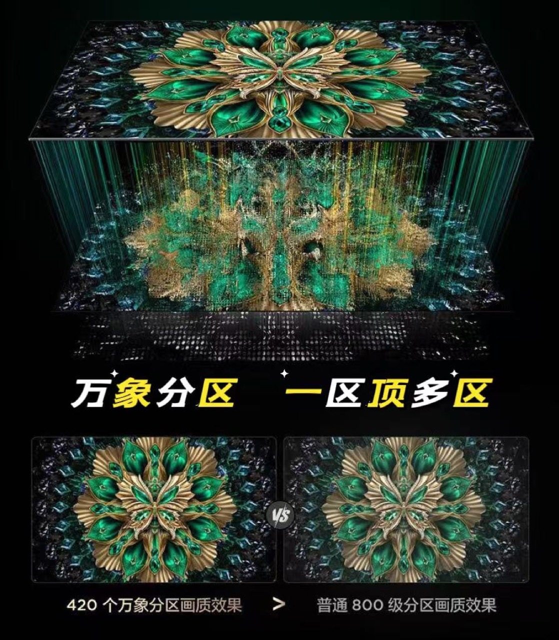 不仅如此,TCL T6L Pro还搭载了万象分区技术,和普通Mini LED分区不同,万象分区从背光到成像的全链路,通过发光芯片、透镜技术、OD设计等7大环节技术进行了升级,在底层技术上就具有先天优势,达到“一区顶多区”的控光实力。就拿85吋的T6L Pro来说,虽然只有420个万象分区,但画质效果却能超越800级普通分区电视。再加上绚彩XDR 1300nits技术加持,不仅亮度表现出色,相比普通XDR和HDR技术的瞬逝峰值亮度,它的峰值亮度输出更持久、更稳定,沉浸体验更好。