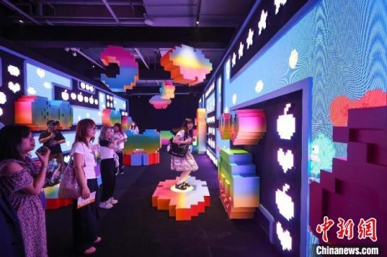 当观众走进超级大苹果装置内,将看到《缤纷愿景》用互动科技及镜面穹顶,让每个人书写专属于自己的无界空间;踏入《像素异想》区域,新媒体装置空间以8-bit像素打造数字化乐园,以斑斓积木重构现实与虚幻的边界;在启用灯光互动编程的《萌力拥抱》,轻轻一拍,将出现治愈的彩色光芒……