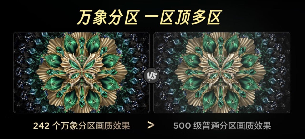 诚然,屏幕作为显示成像的背后一环,其重要性不言而喻,背后的控光技术才是Mini LED画质的真正底气。T6L Pro所搭载的万象分区控光技术,是一套系统Mini LED控光方案,从电视背光到显示成像全链路升级优化,包含聚核光芯、超聚光微透镜、微距OD、超动态光影仿生算法、 双向23bit、 瞬态响应、华星HVA屏等核心技术,万象分区的控光效果是普通分区的数倍,实现了控光精度和响应速度的跃升,带来远超单纯堆分区的真实画质表现。