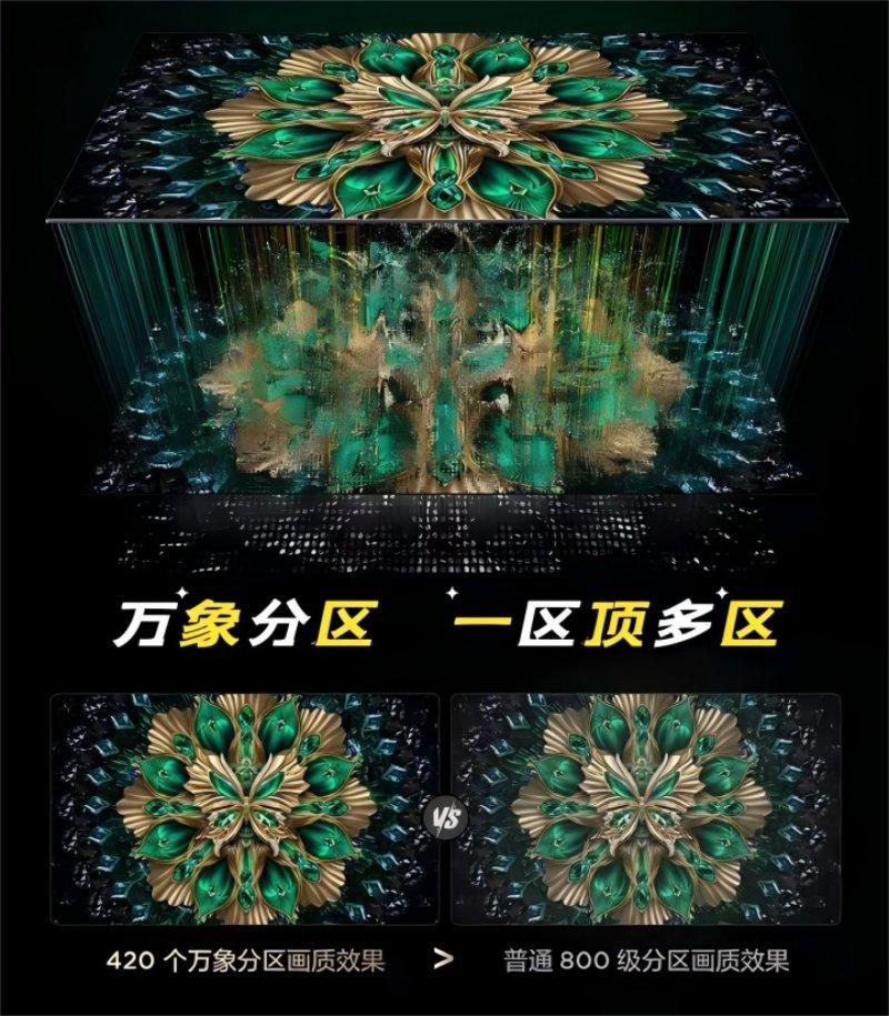 除了硬件素质过硬,控光技术方面TCL T6L Pro也有新突破,它搭载的TCL独创“万象分区”技术,从7大光学环节的全方位技术突破,实现了控光效率质的飞跃,用更少的分区,提供数倍于普通分区的控光效果,以85吋版本的T6L Pro为例,其420个万象分区的控光表现,远超普通800级分区电视,极大提升了HDR片源亮部和暗部细节的呈现,让画面层次感更强,带来极致的视觉体验。