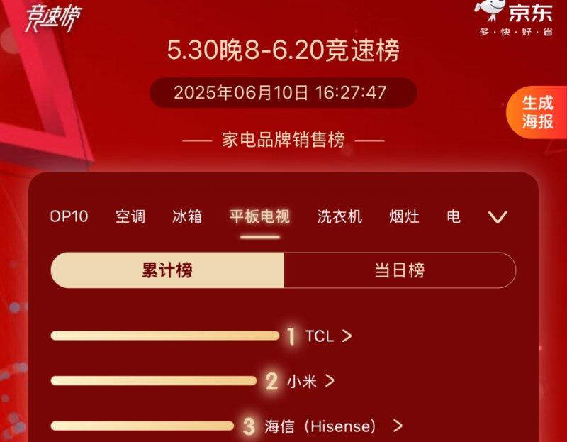 随着史上最长618促销季的深入,叠加国家“以旧换新”补贴政策临近到期窗口,业界预期6月市场将迎来约10%的反弹。TCL依托其覆盖各价位段的明星产品阵列——从Q10L系列的无界沉浸,到T6L Pro的抗反光硬实力,TCL已全面占据618鏖战的制高点,在开门红阶段品牌成交额排行第一的亮眼成绩,为其捍卫年度销冠地位再添胜算。