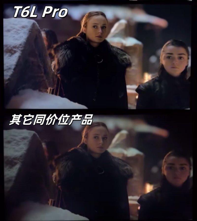 还有,像这类暗部场景多的画面,T6L Pro的画面呈现就很通透,无论是人物轮廓,还是服饰纹理都清晰可见,雪景的层次感也分毫毕现,分分钟就能做到沉浸式观影;相比之下,其他同价位产品,画面发灰发蒙,暗部细节直接消失,人物仿佛融在背景里,这画质还不如刷视频来得痛快。一帧见高下,T6L Pro的万元画质果然不是吹的!