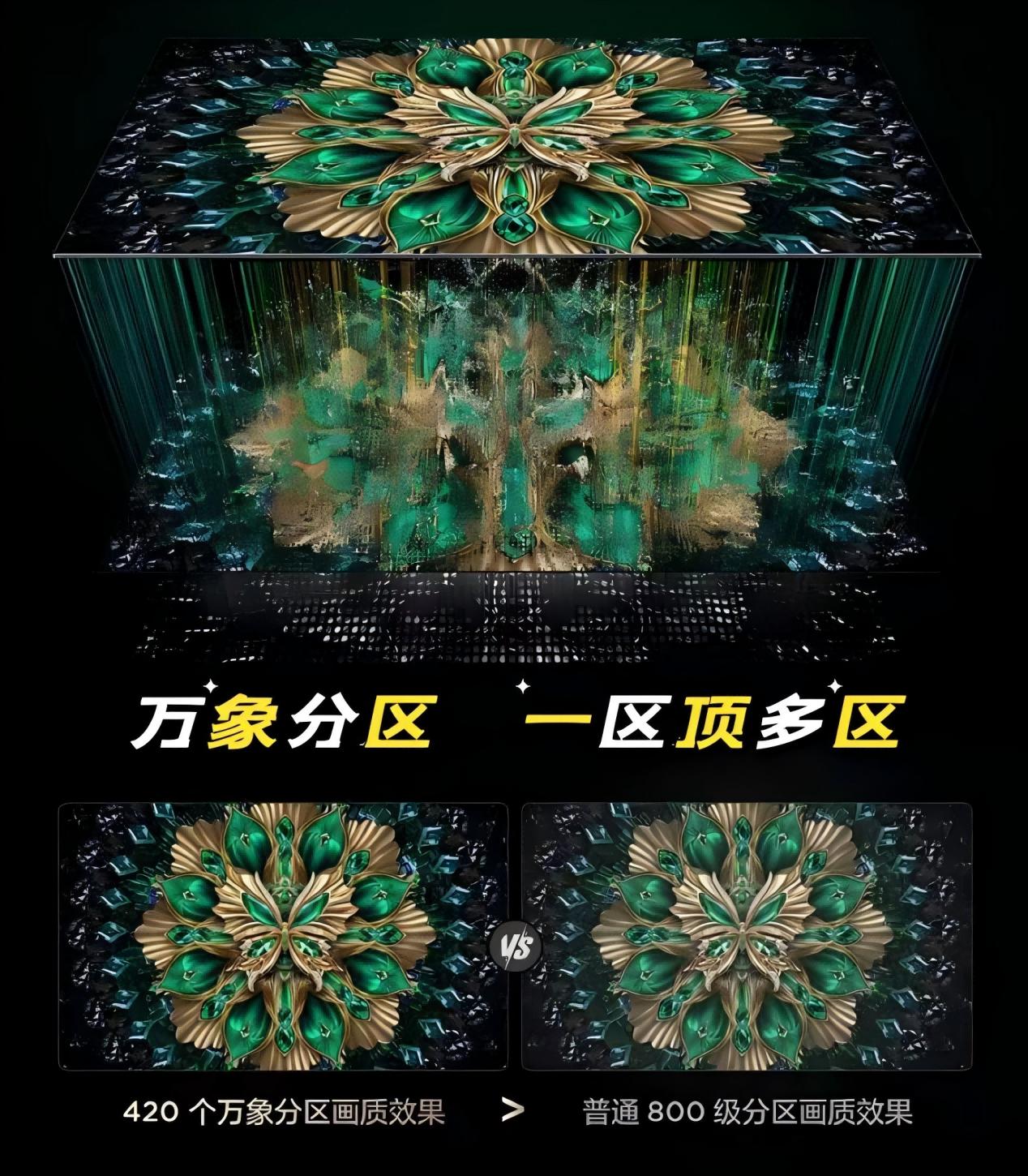 在画面这块,T6L Pro不仅在抗反光上下足了功夫,在控光方面,它也有出色表现。T6L Pro搭载的万象分区技术,在7大光学环节实现了全方位的技术突破,这就让T6L Pro控光效率有了质的飞跃,可以用更少的分区,实现数倍于普通分区的控光效果,以85吋版本的T6L Pro为例,其420个万象分区的控光表现,远超普通800级分区电视,极大提升了HDR片源亮部和暗部间的光晕控制能力,画面细节更细腻清晰。