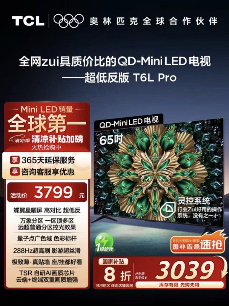 以上这些高端贴心的配置看起来都已经让人很惊喜了,最惊喜还得是它的价格 ——85 吋大屏只要 5000 多,65吋在国补期间更是只需要3000+。要知道同尺寸、同配置的其他品牌,少说也得上万。TCL 凭借全产业链优势,把T6L Pro这种万元级配置的产品下放到这个价位,真正让高端体验走进更多家庭,不得不说,这样的定价既体现了性价比,更彰显了专业度,为用户着想的大品牌确实值得点赞。