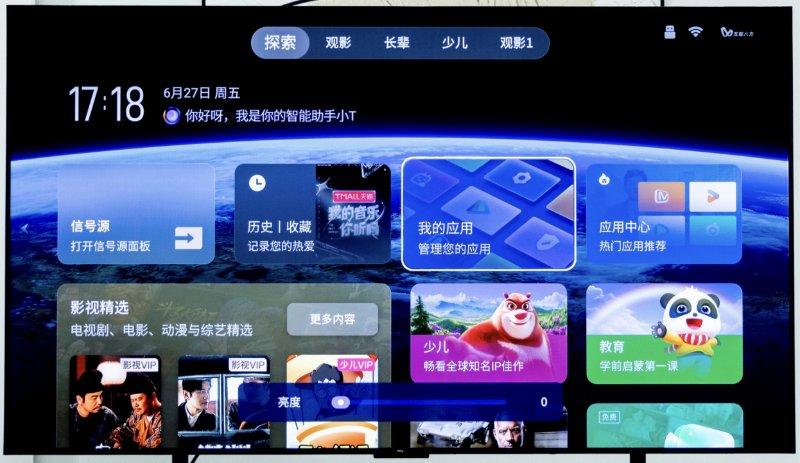 还不止画质惊艳,看朋友操作电视更是一路丝滑。开机秒进画面,没有烦人的广告;界面布局清爽,像手机桌面一样能自定义,一眼找到想看的节目;有时候懒得多动,直接喊 “小 T”服务,连找遥控器这步都省了!