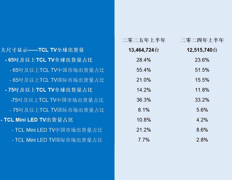 在这波热潮进行中的同时,给大家分享一个非常令人振奋的亮眼成绩:2025年上半年TCL以1364万台的电视出货量稳居全球前二,同比增长7.6%,Mini LED电视更以176.1%的惊人增速横扫市场,再次强势登顶全球第一!这场以TCL为首的中国家电企业显示革命,正以前所未有的势能改写行业未来,也再次印证了TCL以领先的产品技术实力,受到了全球消费者的青睐!