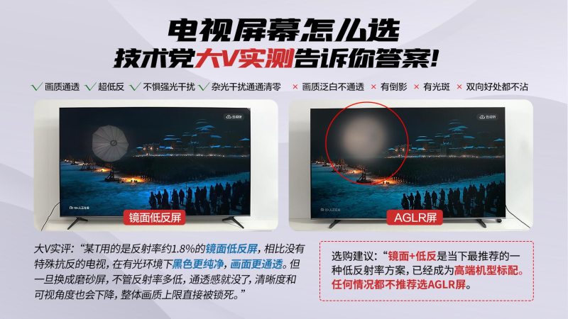 其实从显示设备的使用场景来看,大屏的抗反需求比小屏更突出,毕竟手机反光顶多举着调整下角度,而电视作为家庭核心观影设备,屏幕尺寸大、摆放位置相对固定,一旦遇到反光问题,几乎没有“躲避”的余地。而目前在电视领域,主流的方案其实就两种:AGLR屏和镜面低反屏,其中AGLR屏通过在屏幕表面做微结构处理打散外界光线来减少反光,最终既没获得理想的抗反效果,强光下依然会有模糊的光雾感,又因为其磨砂特性会让画面边缘易模糊、色彩通透度下降,再加上成本升高,对消费者而言属于是花钱买罪受;而镜面低反屏就不一样了,既能有效抑制外界光线反射,明亮环境下也不会出现刺眼光斑或倒影,而且它不会损伤画质,反而能让画面色彩更鲜艳、细节更清晰、对比度更出色,实现“抗反与画质两手抓”,如今早已成为高端显示设备的标配方案。