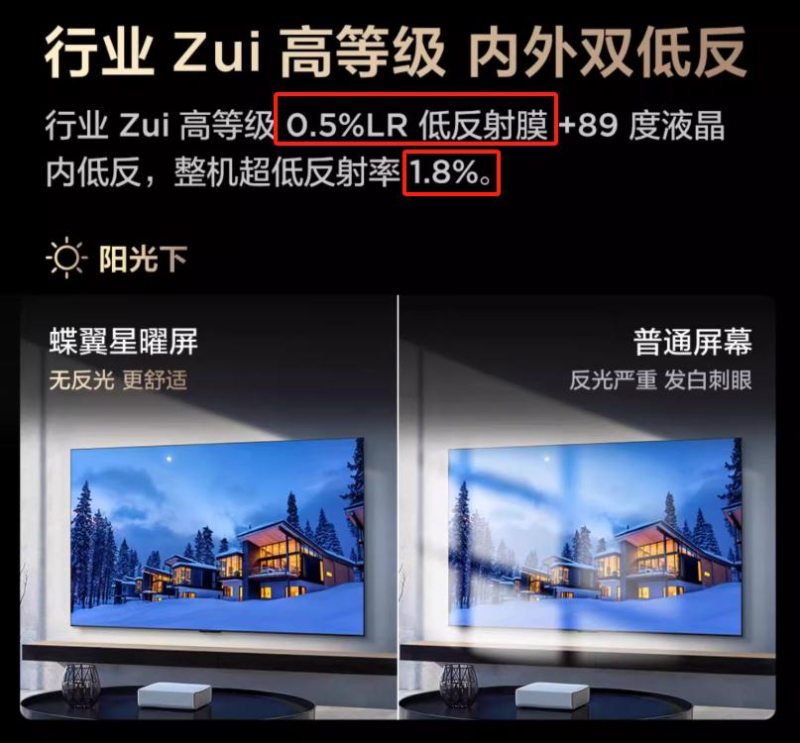 所以在采购电视时需理性分辨“抗反光”背后的技术差异,T7L Ultra则采用了技术门槛高得多的镜面低反方案。其搭载的蝶翼星曜屏,覆盖了行业最高等级的0.5% LR低反膜,并创新性地加入了89°液晶内低反结构,将整机反射率压制在惊人的1.8%,远低于AGLR屏常见的2.6%。这1.8%带来的体验升级是颠覆性的,这意味着,下午在客厅窗边追剧,屏幕上不再有烦人的窗户倒影;晚上开着暖光灯享看剧,画面也不会因为灯光而泛白。T7L Ultra实现了 “抗反光”与“保画质”的兼得,让追剧不再受制于环境光,同时画面通透感十足,随时都能获得最佳状态。