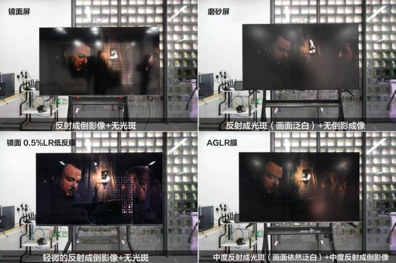 消费者选购电视时,会关注电视是否具备抗反光功能,但是对于不同方案抗反光效果差距,却不甚了解。事实上,很多电视出于成本考虑,采用的是AGLR(磨砂屏+低反膜)抗反光方案,其原理是通过在屏幕表面做微结构处理打散外界光线来减少反光,通俗地说就是给屏幕贴上了一层“磨砂膜”,在抗反光的同时,也降低了画面对比度,整体色彩通透度变得一言难尽。虽然这项技术整机反射率能做到2.6%,但是对整体画质的无差别攻击,实在令人难以接受。