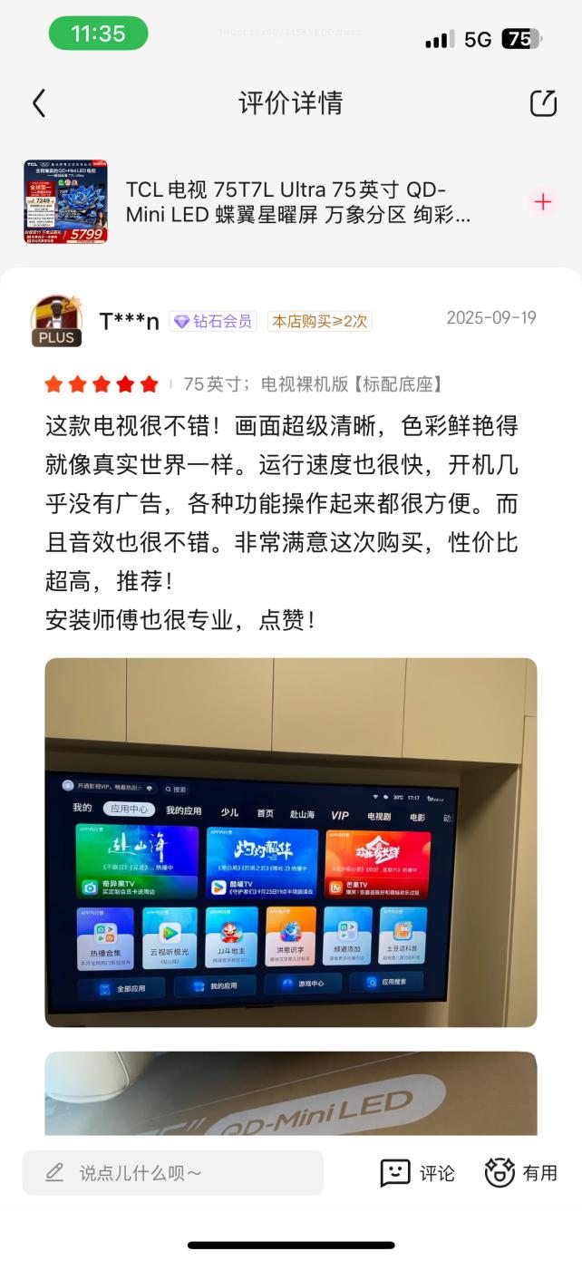 TCL T7L Ultra自开售以来,在京东、天猫等平台屡次售罄,成为消费者口中的“断货王”。这款全网卖爆的QD-Mini LED电视,彻底打破了“没万元预算不敢想高端画质”的魔咒,直接把高端配置拉到几千元价位,重新定义了质价比天花板。正如某电商平台的钻石会员所言:“这款电视很不错!画面超级清晰,色彩鲜艳得就像真实世界一样。运行速度也很快,开机几乎没有广告,各种功能操作起来都很方便。”这些真实声音印证了其技术实力与用户需求的高度契合。