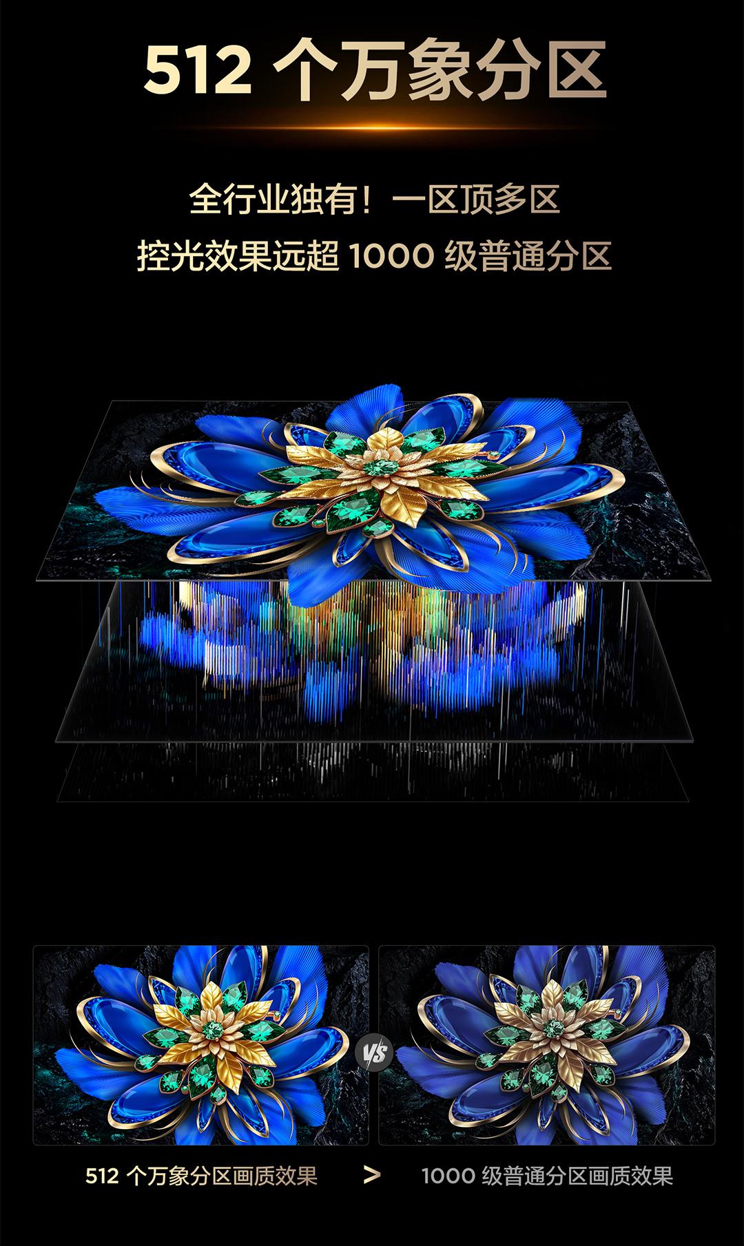 有了卓越的屏幕基底,TCL领先的QD-Mini LED技术得以全面释放其潜能。TCL 98Q6L支持512个万象分区,这是TCL独有的控光技术,实现了发光芯片、透镜技术、OD设计、控光算法等七大底层技术的系统性突破,控光效果“一区顶多区”。TCL 98Q6L的控光效果,远超千级背光分区的传统电视,使景物层次分明,光影过渡自然流畅,让用户彻底告别画面泛白与光晕。
