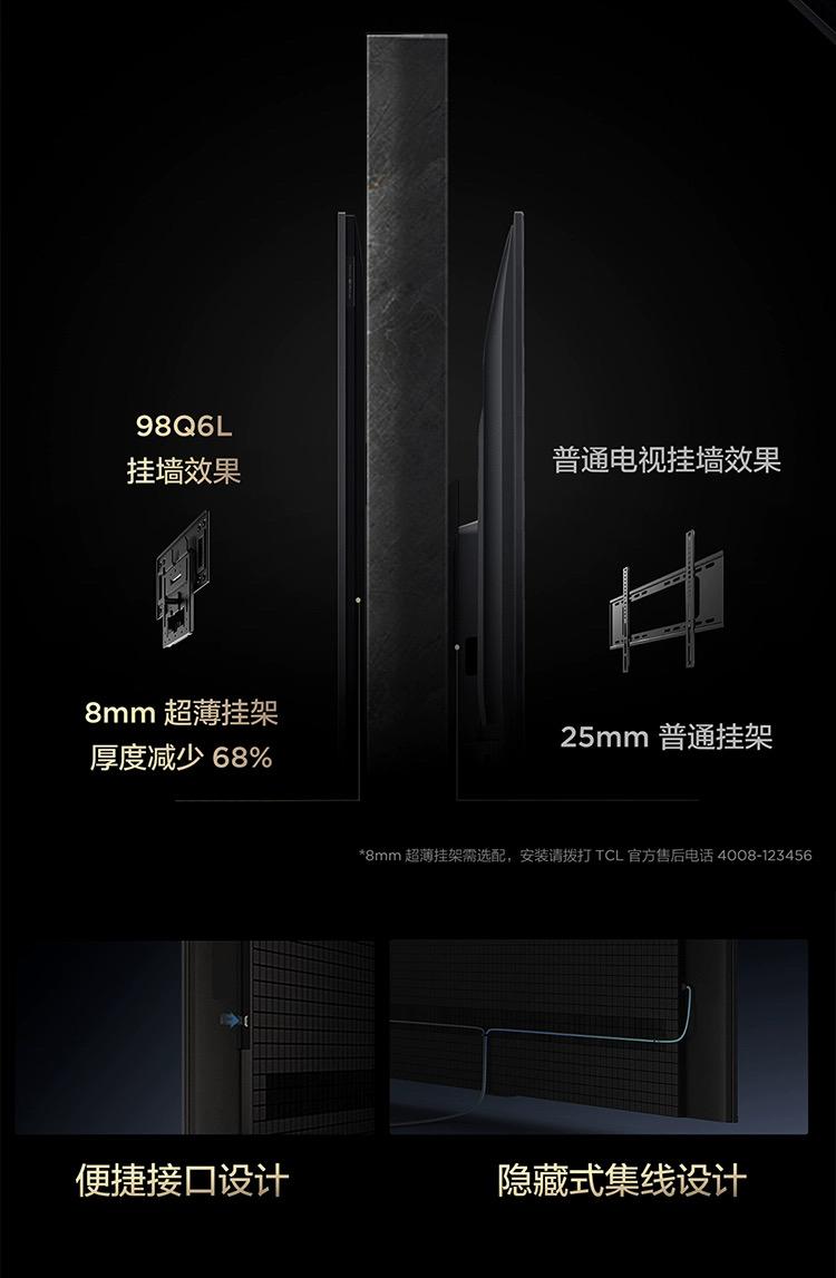 在此背景下,作为全球电视的领跑者,TCL推出了98Q6L QD-Mini LED电视,引领电视行业超大屏消费新潮流。这款新品凭借革命性的“画布屏”、领先的QD-Mini LED技术以及至薄至美的工业设计,直击传统超大屏电视痛点,开启了独属于TCL的品质新纪元。