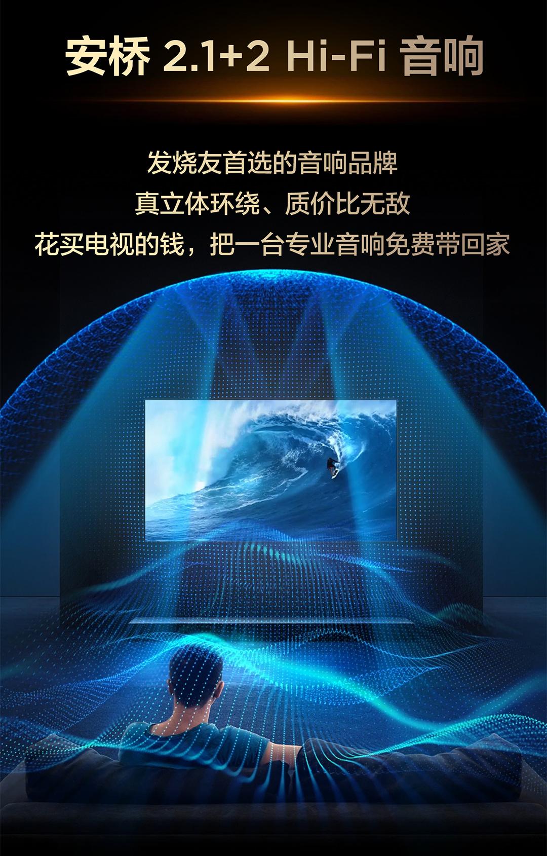 俗话说,影音不分家,出色的画质需要震撼的音效。TCL 98Q6L搭载了与专业音响品牌安桥合作的2.1+2 Hi-Fi音响系统,依托70年的声学积淀,独立的高音单元和低音炮带来了震撼澎湃的音频效果,营造出极具包围感和方位感的3D立体声场,真正将影院级音效搬回家中。