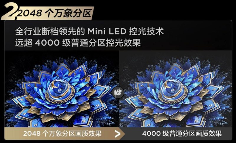 光解决反光问题还不够,画质提升还要考验控光能力。很多人选 Mini LED 电视时,会陷入“分区数越多画质越好”的误区,可实际用下来会发现,有些标榜 “上千级分区” 的产品,依旧存在光线溢散、暗部不清的问题。而TCL T7L Ultra的万象分区就突破了“分区数陷阱”,以一整套系统级的Mini LED控光方案,凭借超聚光微透镜和微距OD等从发光芯片到屏幕全链路7大环节的技术突破,大大提升控光能力,实现“一区顶多区”的效果。以98吋T7L Ultra为例,它配备2048个万象分区,控光效果却能远超普通4000级分区产品,以少胜多,打造同价位最强控光效果。TCL“万象分区”从底层出发更精细地处理光线,可以说是Mini LED未来发展的标准解法。